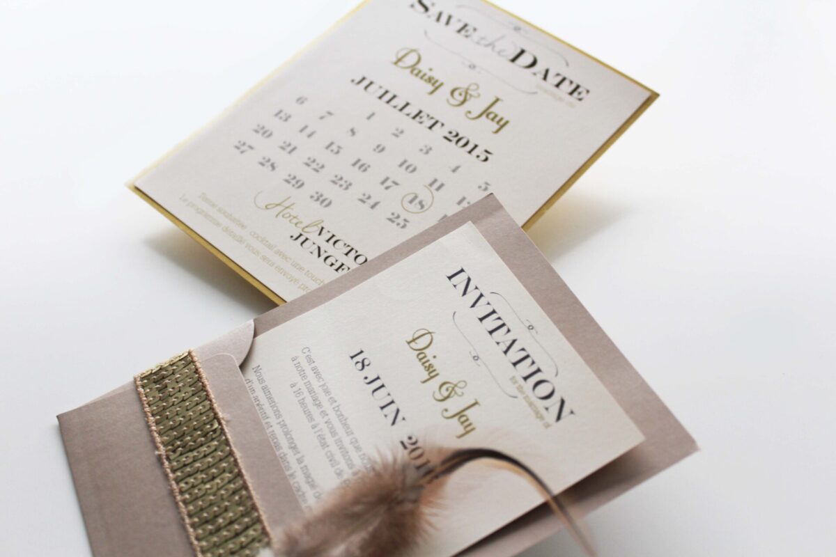 Format allongé 12 x 18 cm – impression couleur recto pour le save the date. Pochette pour l’invitation – ruban avec strass et plume.